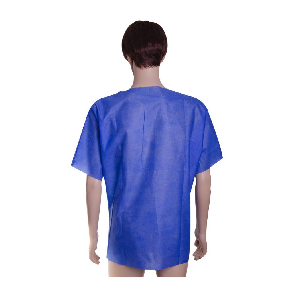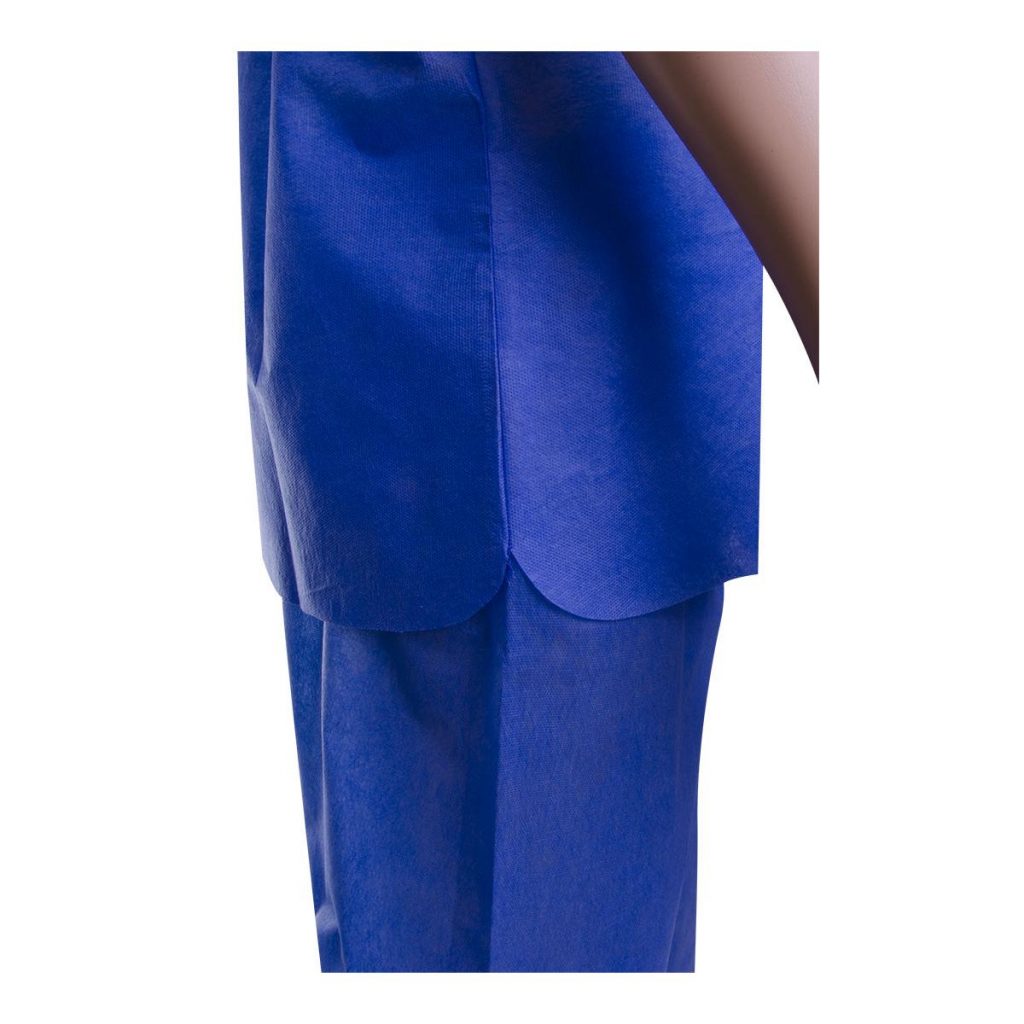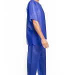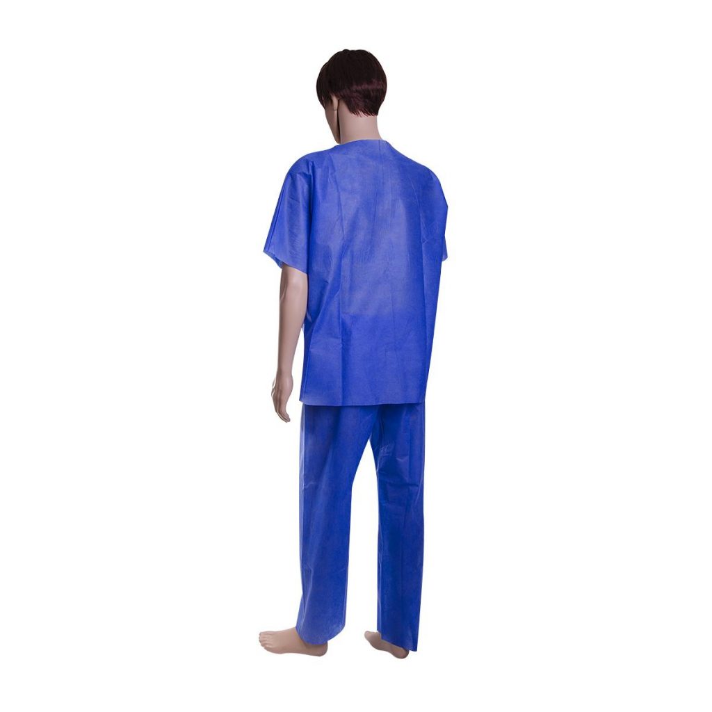 Komplet se skládá z haleny a kalhot v modré barvě, které jsou navrženy v unisex střihu pro pohodlné nošení. Kalhoty jsou vybaveny tkanicí v pase pro snadné přizpůsobení. Díky lehkému a prodyšnému materiálu je oděv vhodný pro celodenní nošení bez nepříjemného pocitu přehřátí. Pokud není poškozen, lze modrý jednorázový komplet použít opakovaně.