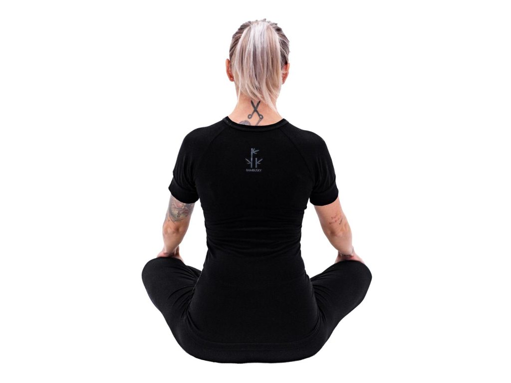 Bambusové tričko dámské Bambusky s krátkými rukávy v černé barvě vyrábíme z jemného přírodního materiálu bambusové viskózy, které se přezdívá chytré vlákno. Bambusové oděvy jsou hebky měkké, prodyšné a k pokožce velmi příjemné. Bambusové oblečení má navíc antibakteriální vlastnosti díky tomu, že jsou bambusová vlákna přirozeně rezistentní proti plísním i bakteriím. Bambusové oblečení má navíc termoregulační schopnost, v létě chladí a v zimě hřeje. V bambusovém oblečení příjemně voníte celý den – bambusová vlákna obsahují přírodní složky, které nedovolí průniku a následnému usazování potu či jiným nepříjemným pachům ve struktuře tkaniny. Materiál: 95% bambusová viskóza 5% bavlna, 210g/m2. Praní: na 30°C.