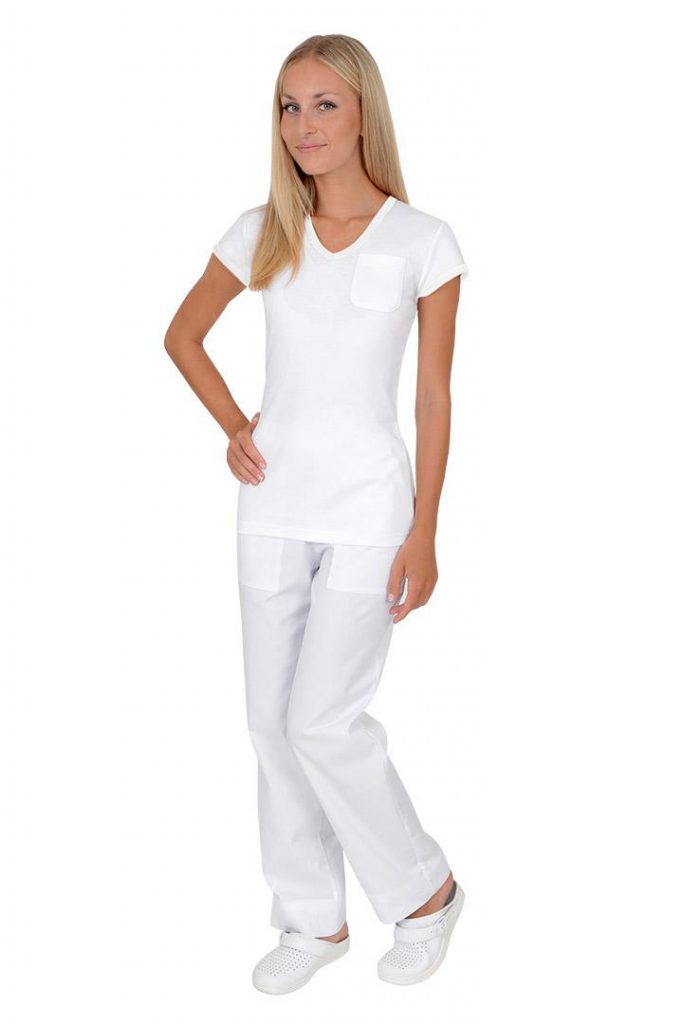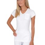 Dámské triko s lehce tvarovaným střihem z velmi příjemného a zdravotně nezávadného materiálu, výstřih do V a kapsička na prsou. Materiál: 100% bavlna, 190 – 200g/m2. Praní: na 40°C.