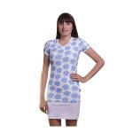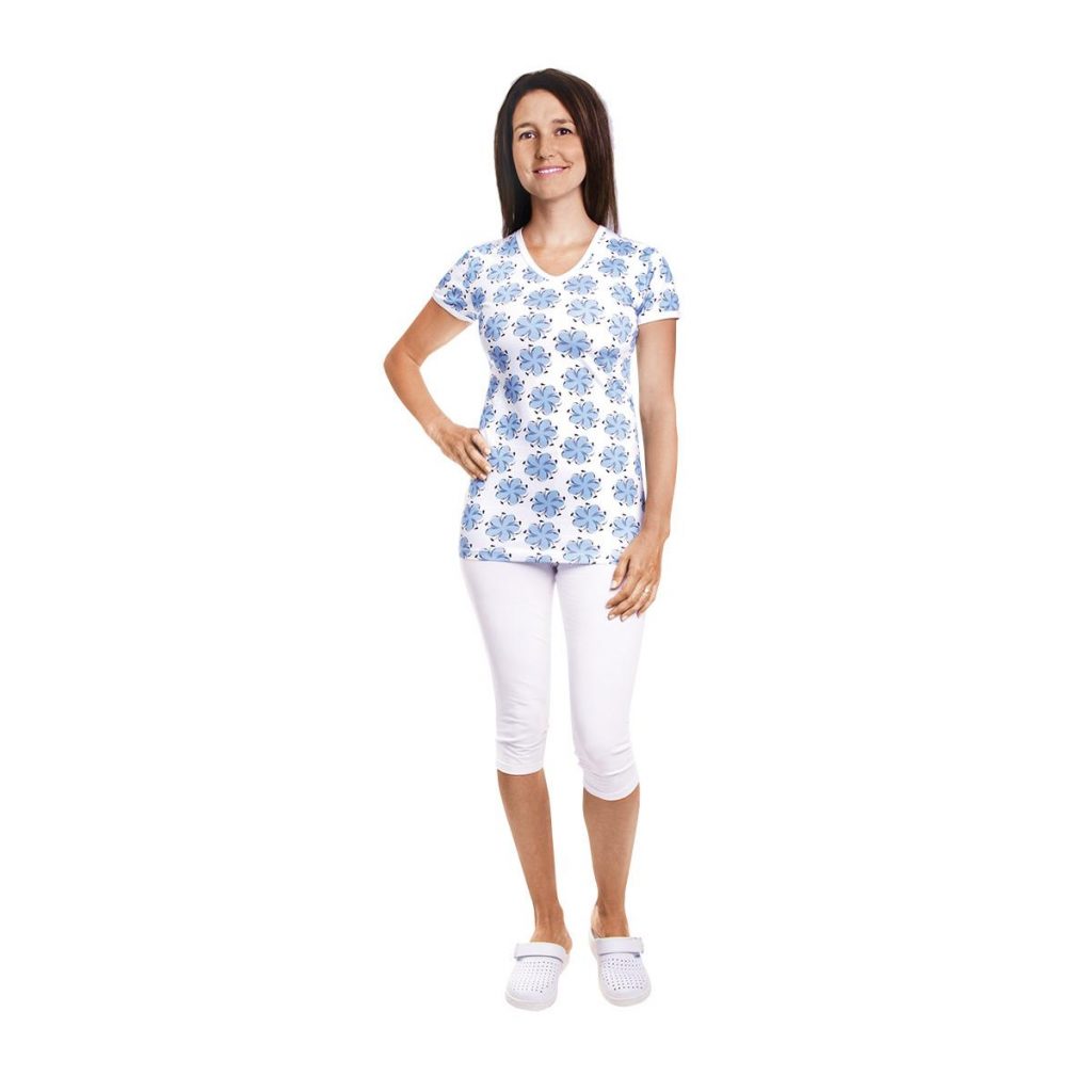 Dámská trika Vito Flora se světle modrým potiskem, výstřihem do V a krátkými rukávy, mají lehce projmutý střih, dík kterému je nošení velmi pohodlné a bude vás bavit. Materiál: 92% bavlna 8% elastan, 210g/m2. Praní: na 30°C.