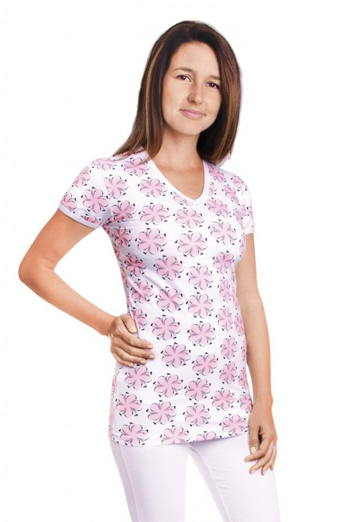 Dámské triko Vito Flora se světle růžovým potiskem, výstřihem do V a krátkými rukávy, má lehce projmutý střih, dík kterému je nošení velmi pohodlné a bude vás bavit. Materiál: 92% bavlna 8% elastan, 210g/m2. Praní: na 30°C.