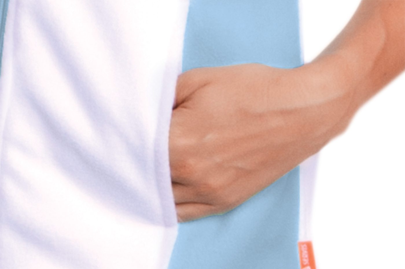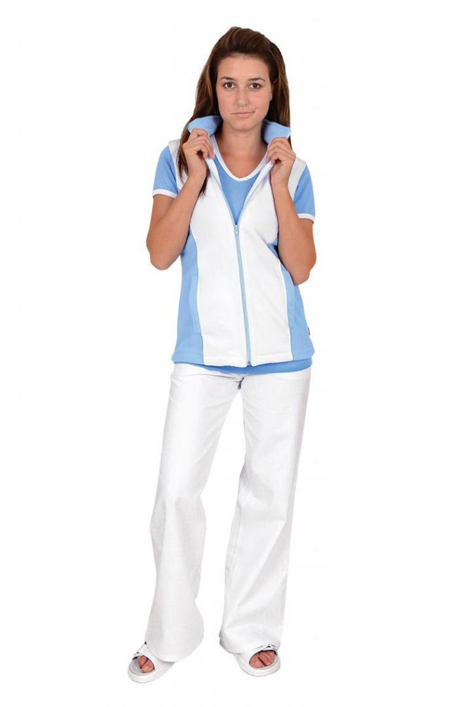 Fleecová vesta Fitnes v líbivé barevné kombinaci bílé a světle modré barvě, s celopropínacím zapínáním na zdrhovadlo a dvěma kapsami. Materiál: 100% PES s protižmolkovou úpravou 280g/m2. Praní: na 30°C.