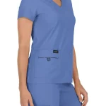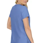 Moderní Halena Becca v nebesky modré barvě, s klasickým výstřihem do V, lehká tkanina odvádějící vlhkost, 4 kapsy včetně skryté kapsy na mobil s potiskem podšívky, pružná smyčka pro uchycení jmenovky, kontrastní potisk na spodní straně lemu krku, lehký strečový materiál, který není nutné žehlit, vícestehové prošívání ve švech pro delší životnost oděvu. Materiál: 95% polyester + 5% spandex. Praní: na 30°C.