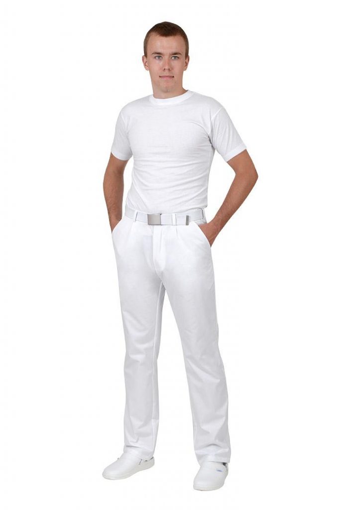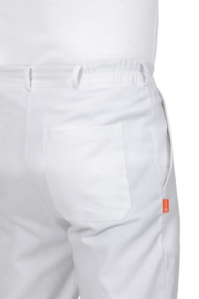Lékařské kalhoty pánské bílé Kap26 Hari mají klasické přední zapínání na knoflíky s gumou v části pasu. Pásek není součástí dodávky. Materiál: 100% bavlna, sanfor., merc. 200g/m2. Praní: na 95°C.
