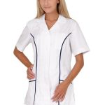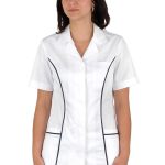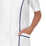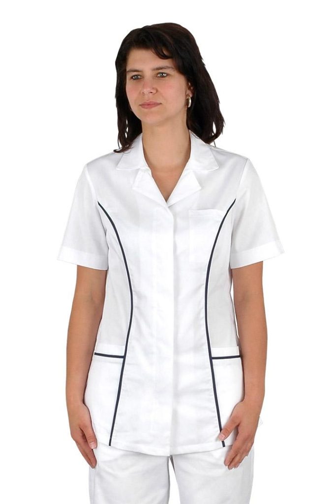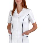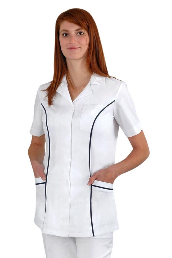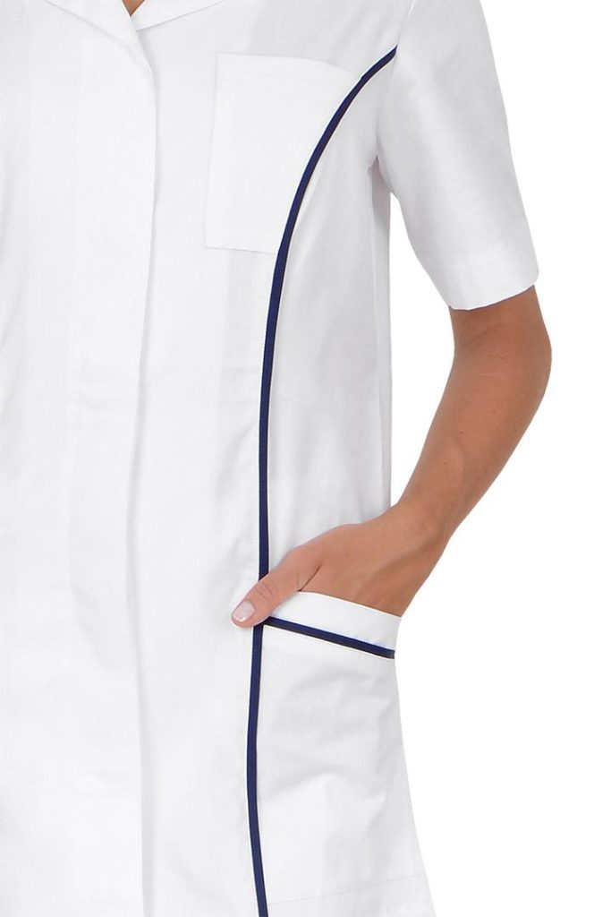 Lékařské pracovní haleny dámské Faza-2 mají zeštíhlující princesový střih a fazónu, klasické celopropínací zapínání na knoflíky, na předním díle 3 nakládané praktické kapsy, 5mm ozdobné proužky na dolních kapsách a v členícím švu, zadní díl je vypasován záševky a dolní rovný kraj s krátkými bočními rozparky. Materiál: 50% bavlna, 50% PES, sanfor. 170g/m2. Praní: na 60°C.