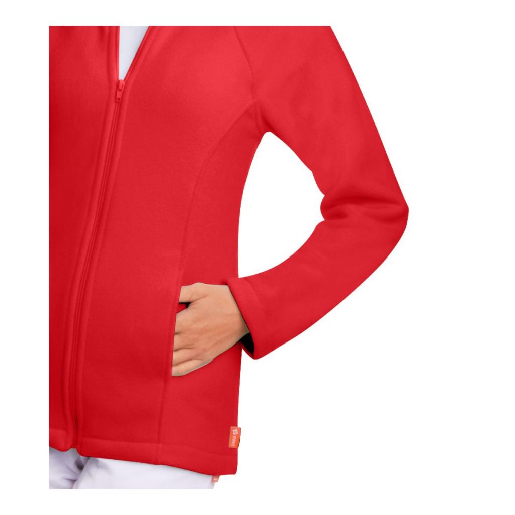Mikina fleecová dámská K1 s dlouhým rukávem a celopropínacím zapínáním na zdrhovadlo, vpředu 2 kapsy. Materiál: 100% polyester 280g/m2, s protižmolkovou úpravou. Praní: na 30°C.