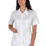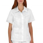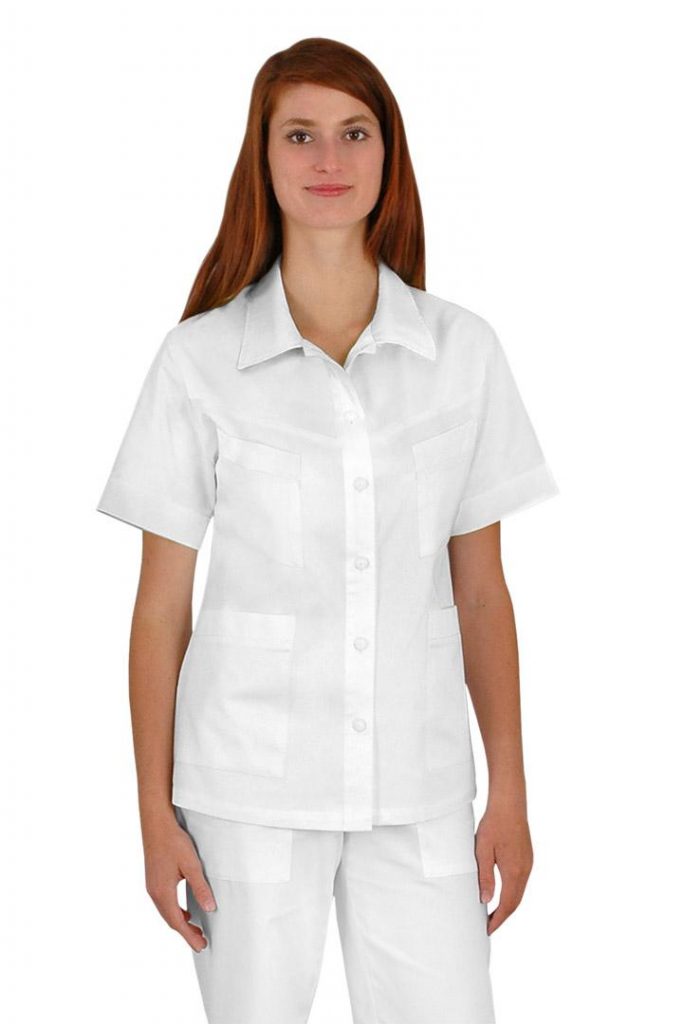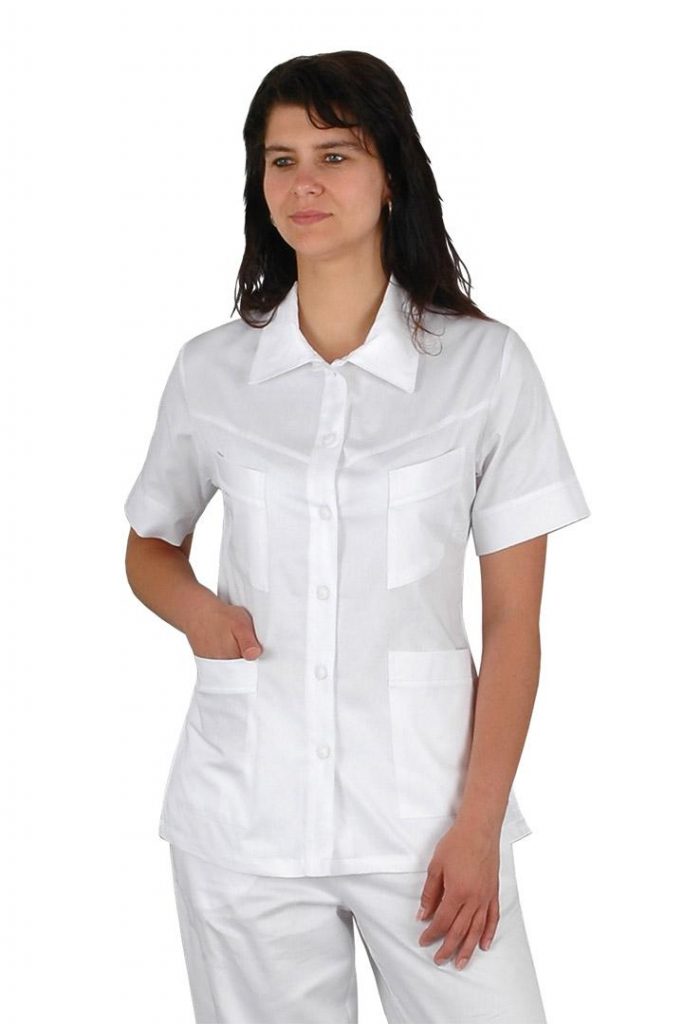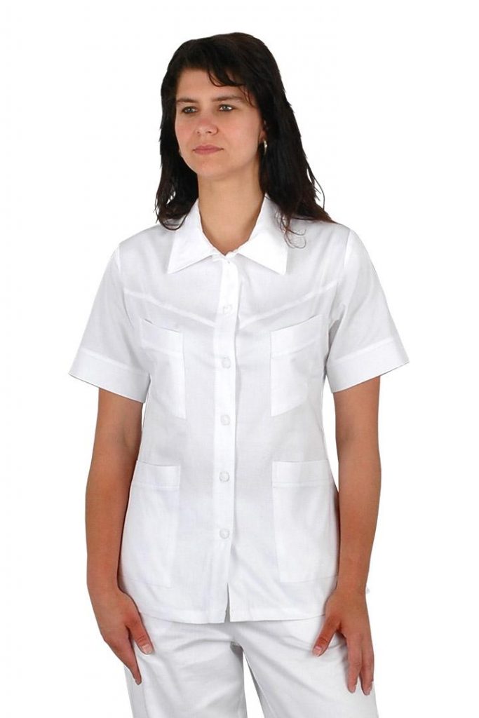 Pracovní halena Lady-J s mírně vypasovaným střihem má celopropínací zapínání na knoflíky. Průkrčník halenky je zakončený límcem a na předním díle jsou 4 nakládané kapsy. Materiál: 100% bavlna, sanfor., merc. 160g/m2. Praní: na 95°C.