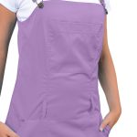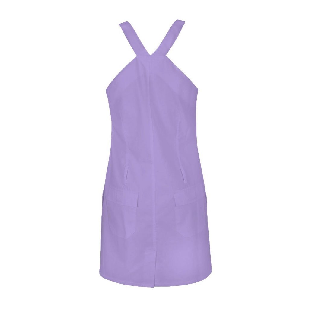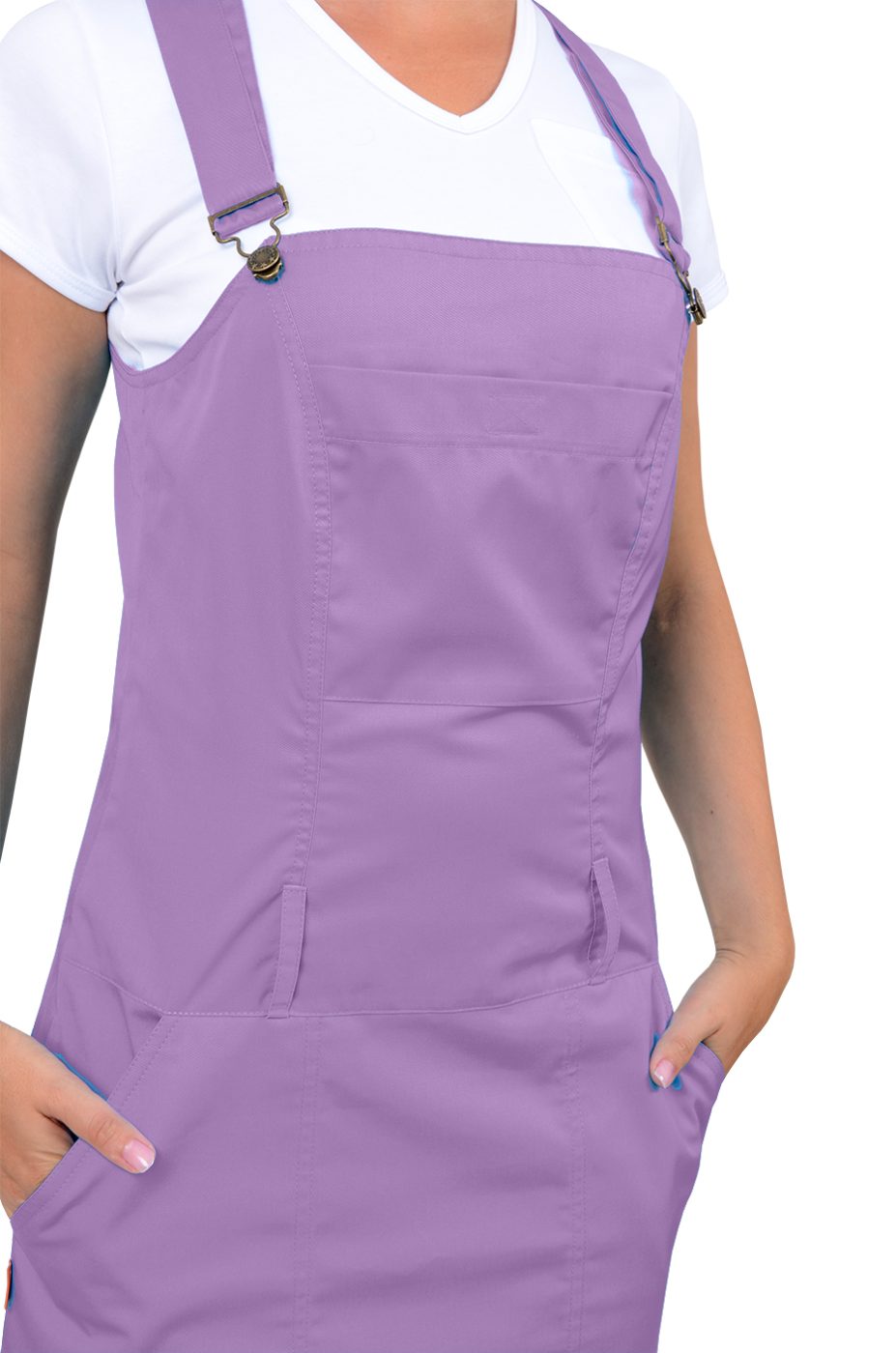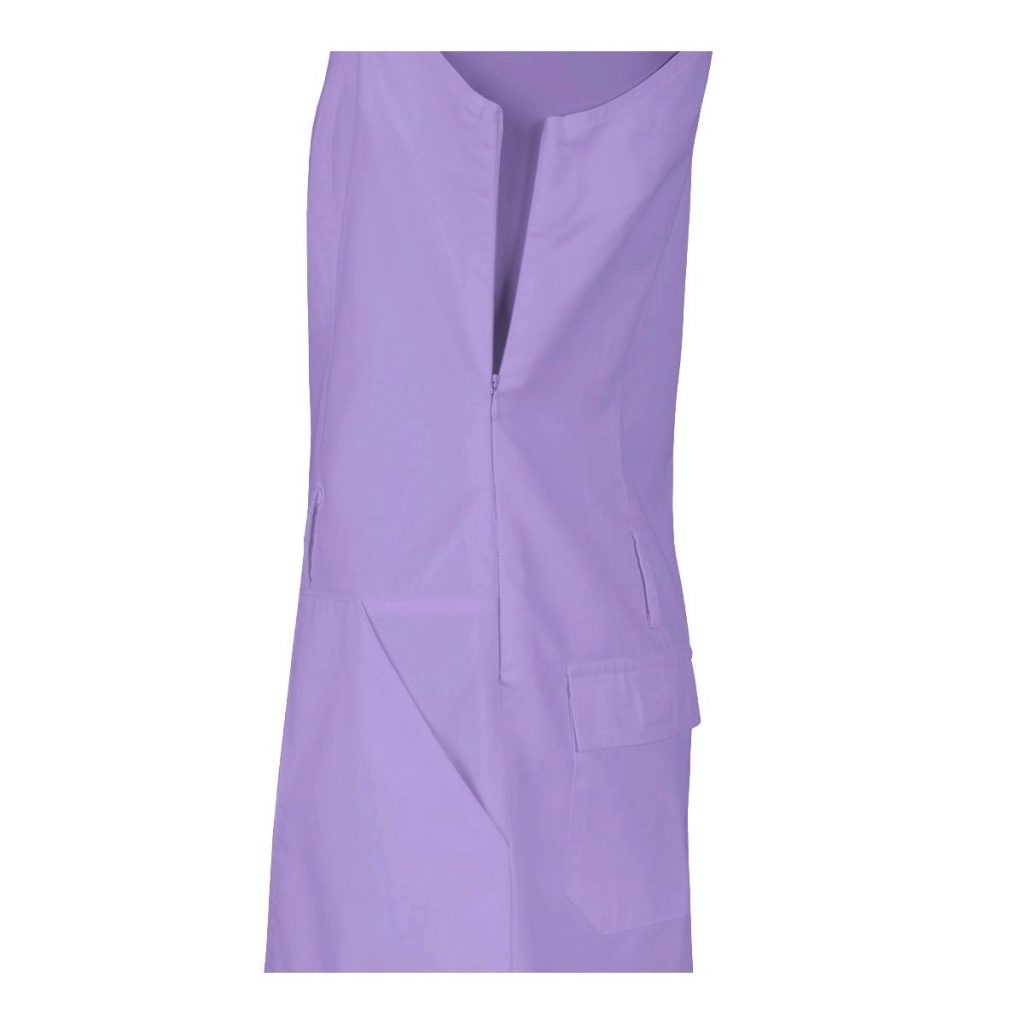 Dámské šaty s laclem Toffi fialové sportovního vzhledu s ozdobným dvojitým štepováním a 5 kapsami, sukně je mírně rozšířená se zapínáním na zdrhovadlo v bočním švu. Součástí dodávky není pásek. Materiál: 50% bavlna, 50% PES, sanfor. 170g/m2. Praní: na 60°C.