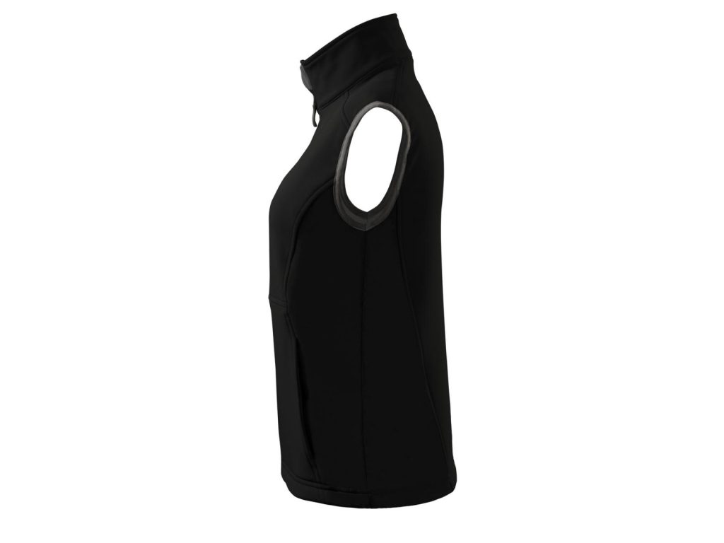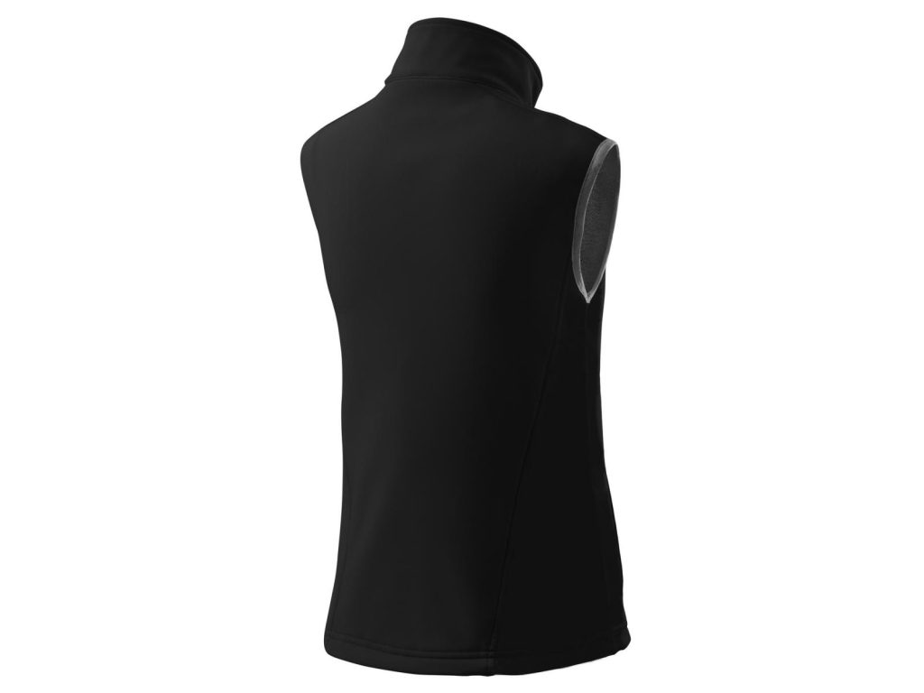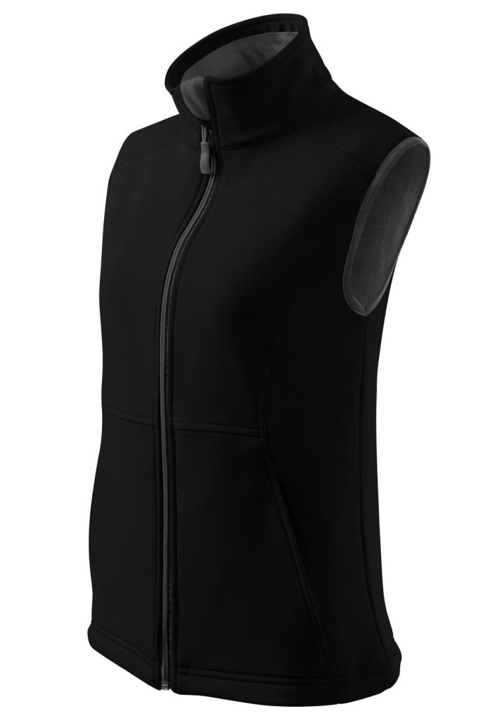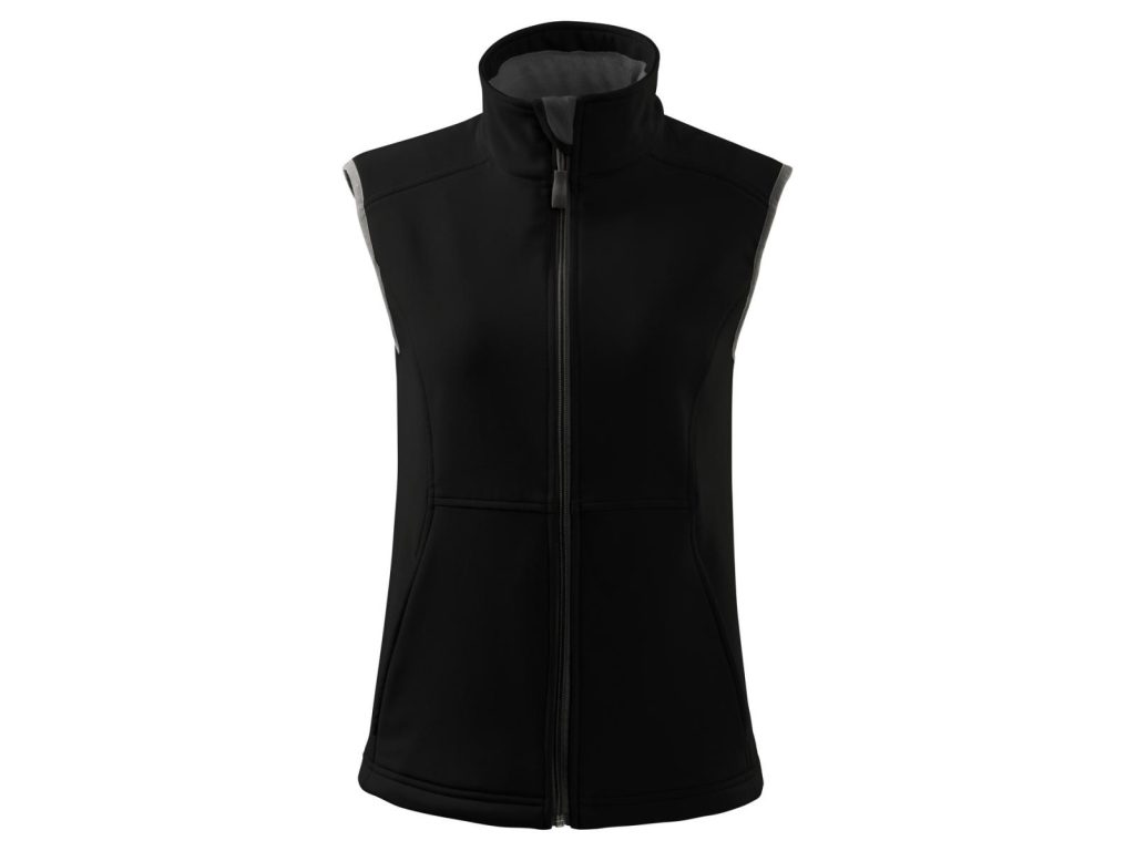 Softshellová dámská vesta černá z 2vrstvého softshellu má lehce vypasovaný střih, vnitřní fleece s antipilingovou úpravou, kontrastními prvky, celopropínacím spirálovým zipem s krytkou brady, v dolním lemu lze stáhnout elastickou šňůrkou, kapsy na zip skryté v členících švech. Materiál: Softshell – 94% polyester, 6% elastan, Fleece – 100% polyester 280g/m2. Praní: na 30°C.