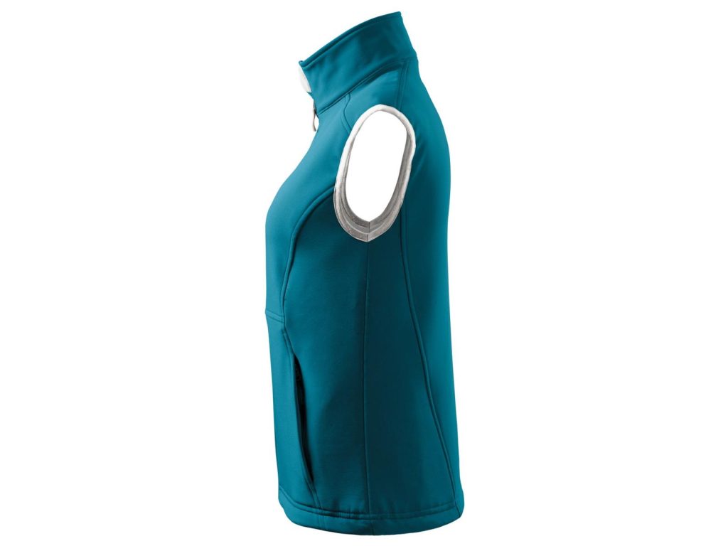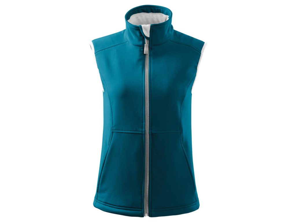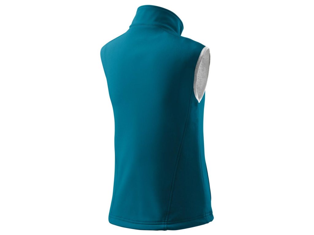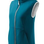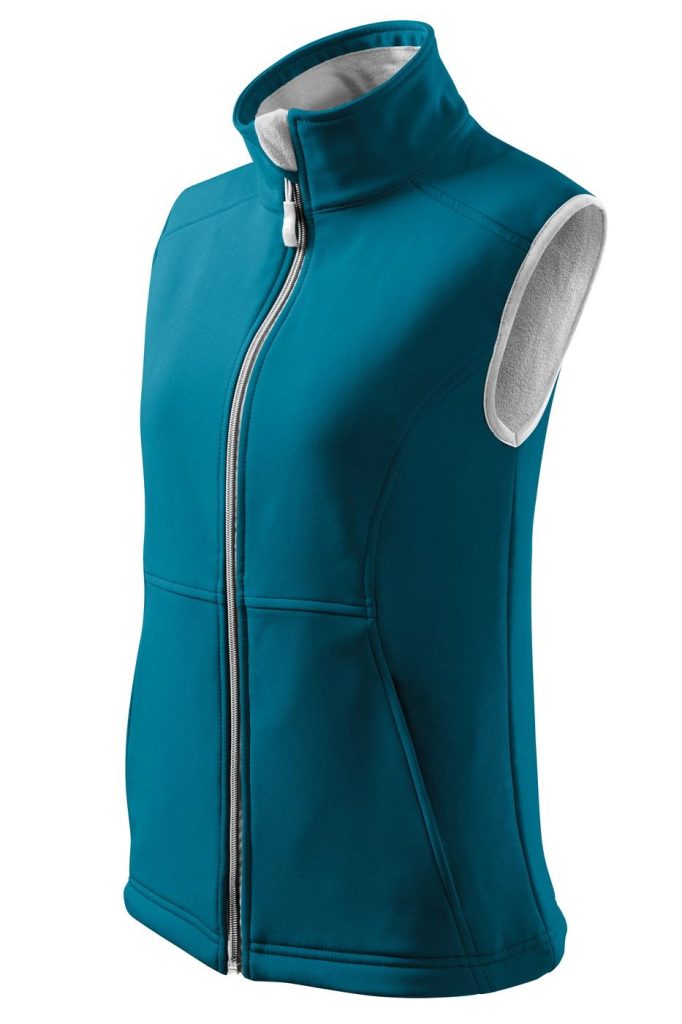 Softshellová dámská vesta tyrkys tm. z 2vrstvého softshellu má lehce vypasovaný střih, vnitřní fleece s antipilingovou úpravou, kontrastními prvky, celopropínacím spirálovým zipem s krytkou brady, v dolním lemu lze stáhnout elastickou šňůrkou, kapsy na zip skryté v členících švech. Materiál: Softshell – 94% polyester, 6% elastan, Fleece – 100% polyester 280g/m2. Praní: na 30°C.