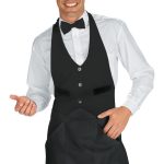 Pracovní zástěra Garcon černá je ideální pro personál pracující ve vinárnách, hospodách či vinotékách. Díky univerzální velikosti se hodí pro každého a její krátký střih poskytuje pohodlí při práci. Praktickým doplňkem jsou dvě kapsy, které umožňují snadné uložení drobných předmětů. Dekorativní prvek v podobě falešné vesty s knoflíky dodává zástěře elegantní vzhled.