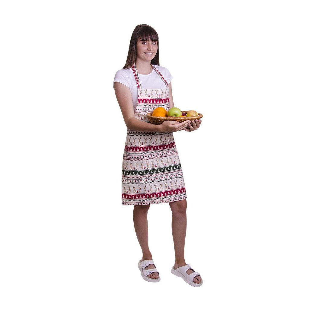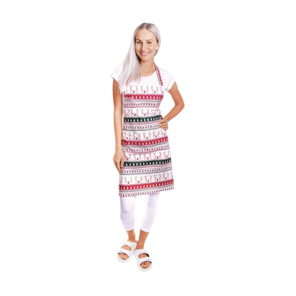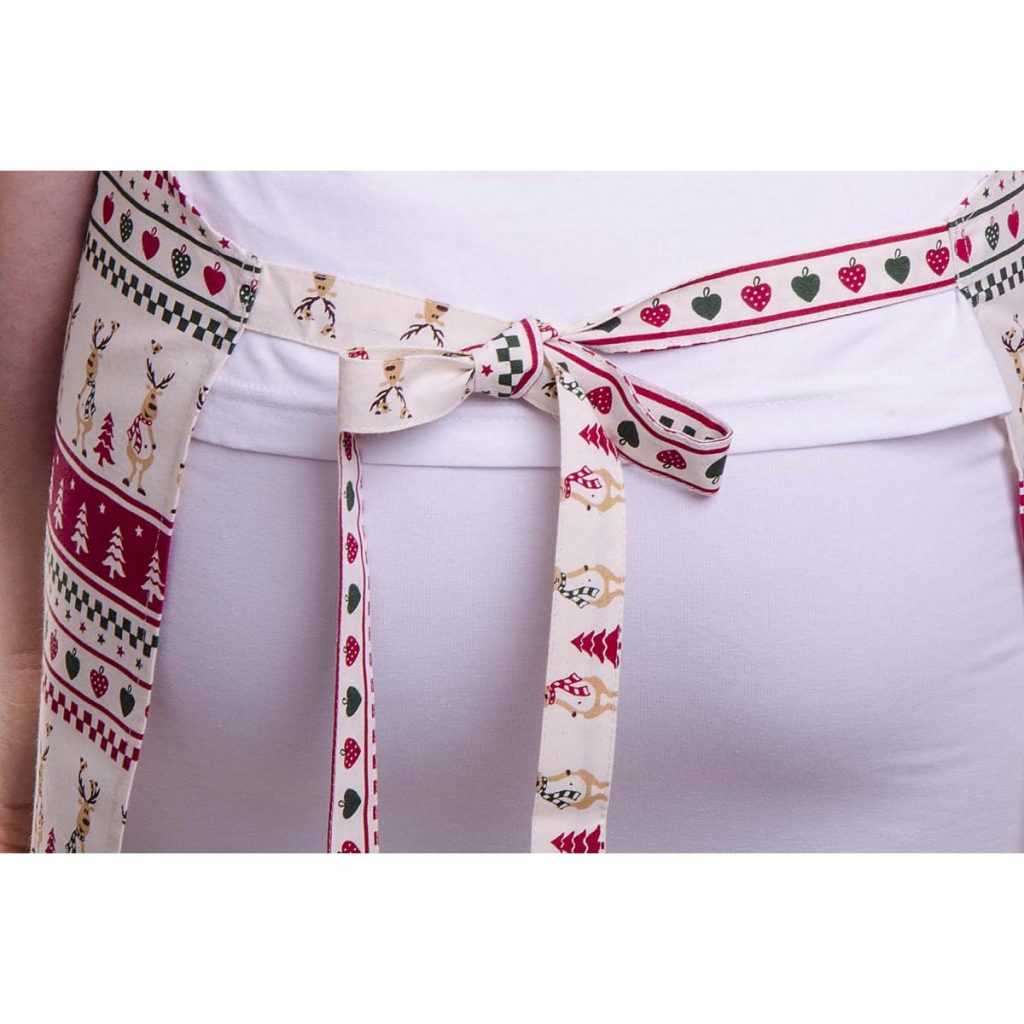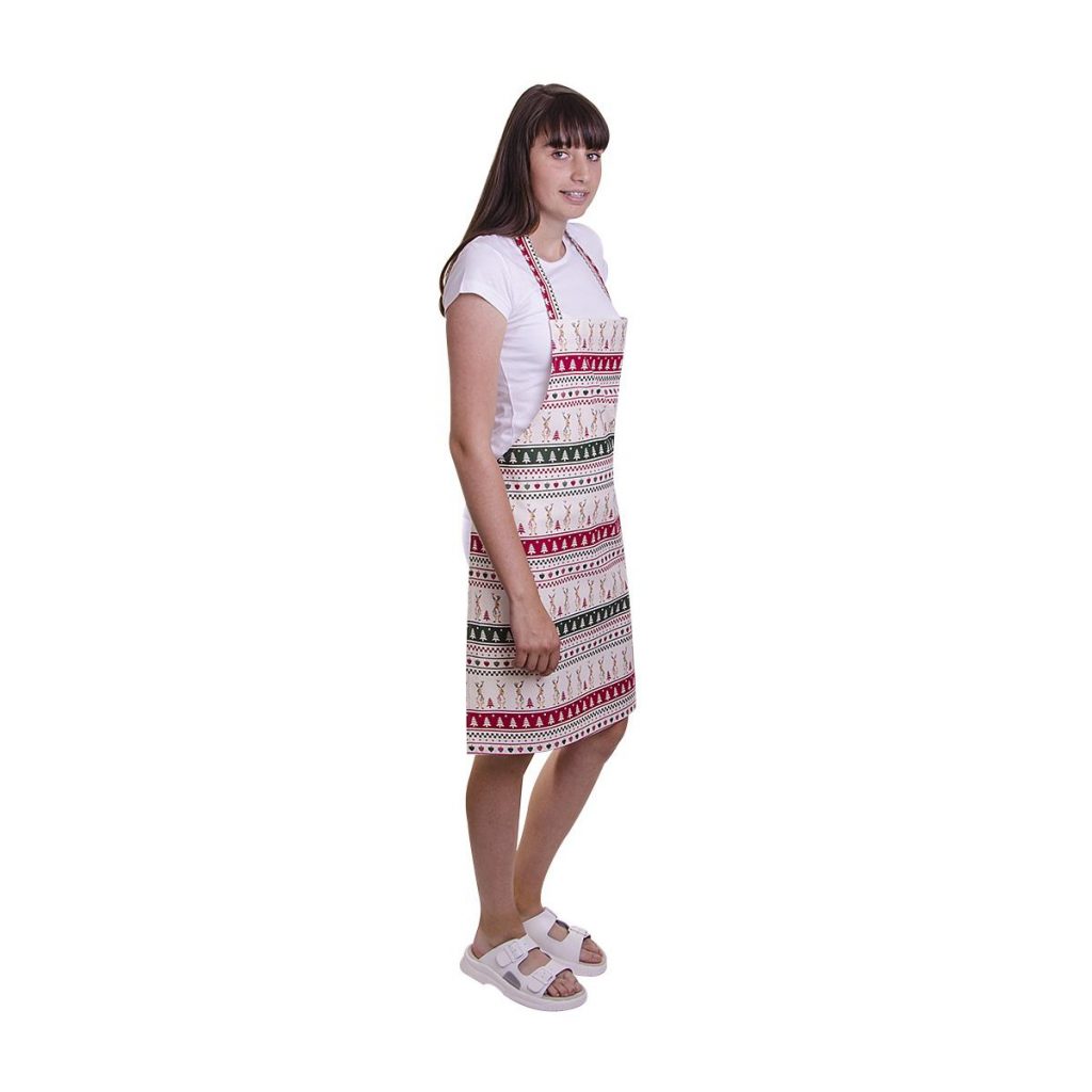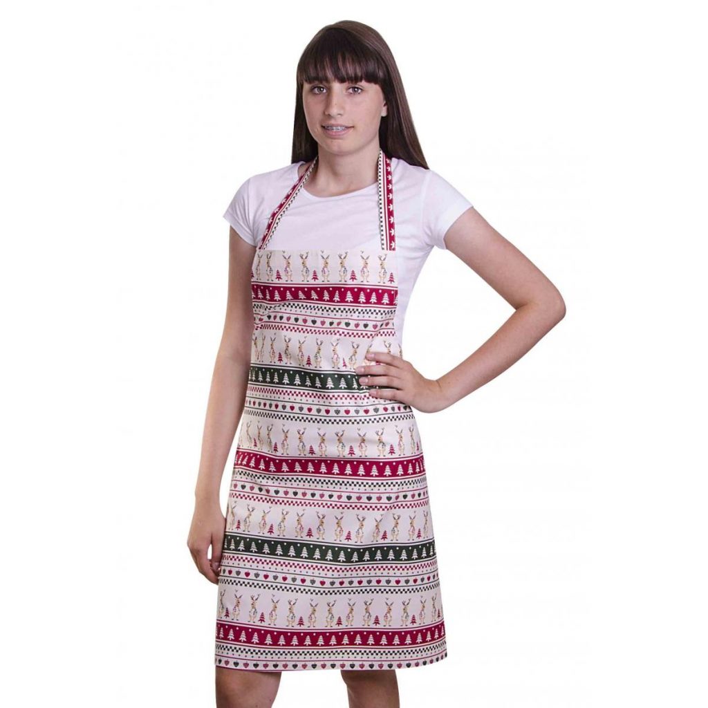 Stylová zástěra se vzorem vánočních sobů s laclem a praktickým zavazováním vzadu. Materiál: 100% bavlna, 150g/m2. Rozměry: 65cm šířka, 68cm délka (výška). Praní na 40°C.