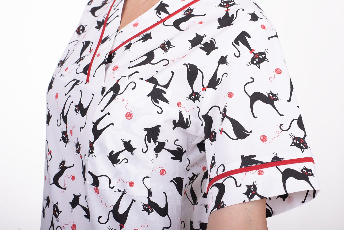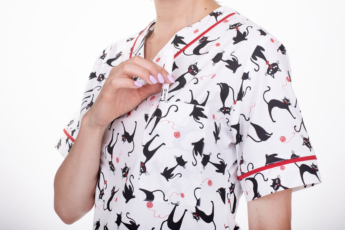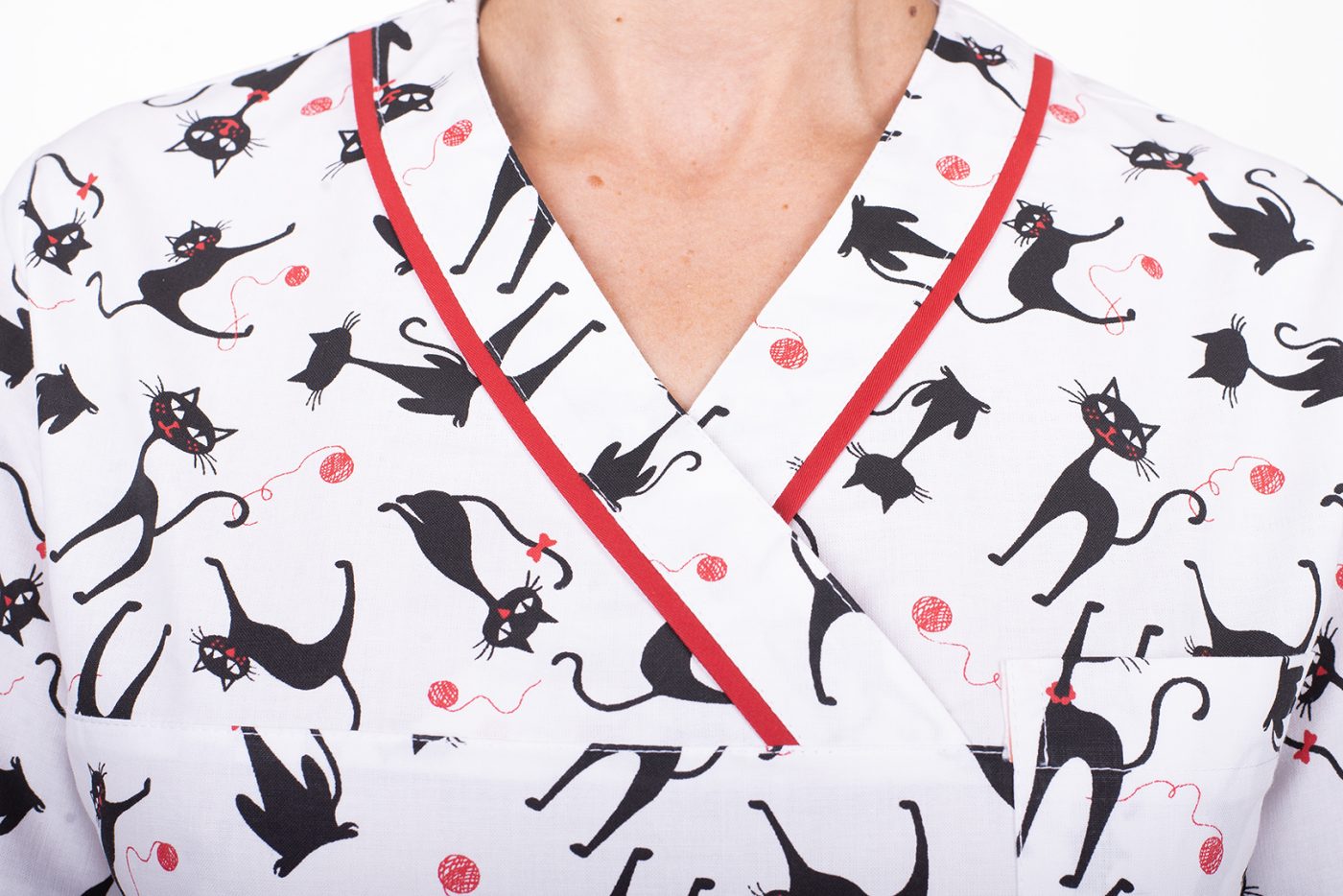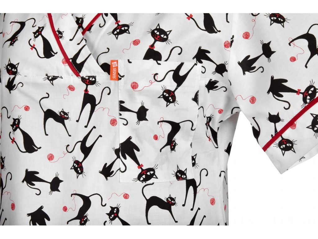 Originální motiv roztomilých koček na bílém podkladu působí přátelsky, svěže a vesele. Takový design ocení nejen zdravotníci pracující s dětmi, ale také v ambulancích, kde je důležitý pozitivní první dojem. Zdravotnické haleny s potiskem se tak stávají nejen nástrojem pohodlí, ale i prostředkem pro vytvoření příjemné atmosféry mezi personálem a pacienty.