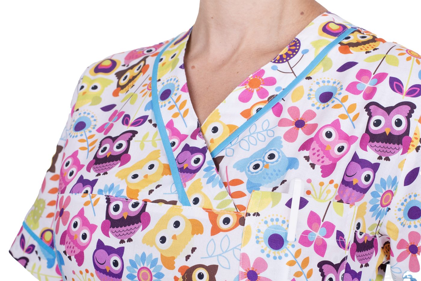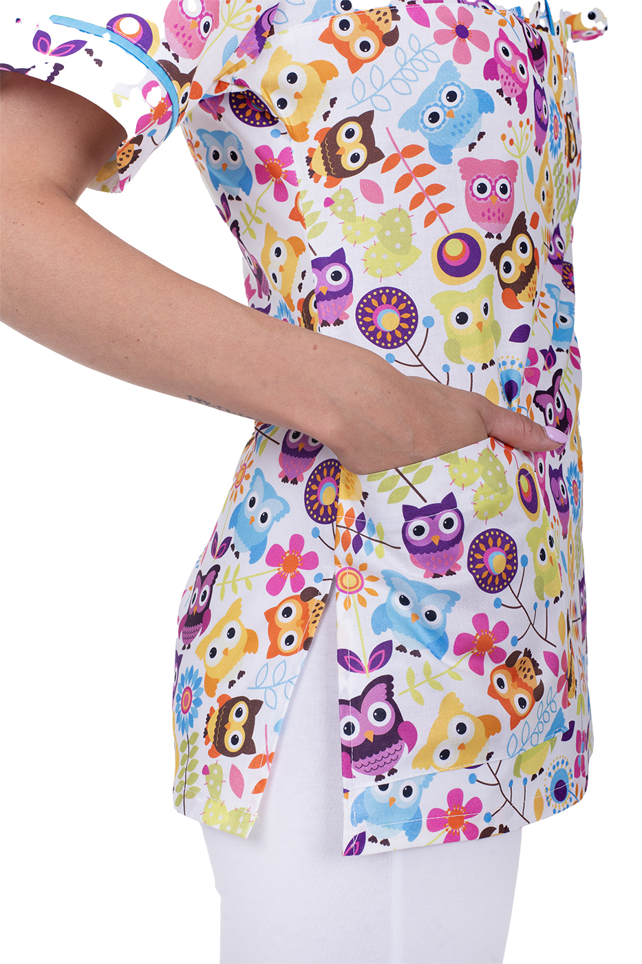 Tato halena je navržena pro ženy, které hledají kvalitní a pohodlný pracovní oděv s osobitým vzhledem. Motiv soviček v pastelových tónech působí pozitivně a přátelsky, a je obzvlášť oblíbený v dětských ordinacích, na pediatrii, v nemocnicích, lékárnách nebo domovech pro seniory. Zároveň je však dostatečně vkusný a decentní, takže se halena hodí i do běžného zdravotnického provozu či kosmetického nebo wellness prostředí.