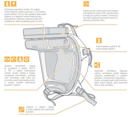 Maska kryje celý obličej, nos, ústa i oči. Tím, oproti běžně užívaným respirátorům, chrání nejen dýchací cesty, ale i sliznice, kterými by se virus mohl dostat do těla. Navíc je v masce udržován přetlak, díky němuž se lépe dýchá i po několika hodinách používání. Ventilátor přesně dávkuju množství vdechovaného vzduchu.